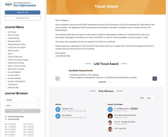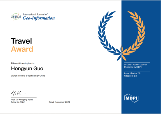 本网讯(通讯员 张俊杰 李星雨)近日,悟空体育工业工程专业博士生郭宏运荣获国际地理信息科学期刊(ISPRS International Journal of Geo-Information,IJGI)颁发的国际学术旅行奖(IJGI Travel Awards),成为本年度两名获奖者之一,另一位为英国伦敦大学学院博士生llya llyankou。该奖项面向全球地理信息相关专业博士生自由开放申请,自2017年设立以来已成功颁发八届,共有15名博士生获奖,郭宏运是首位来自中国大陆高校的获奖者。